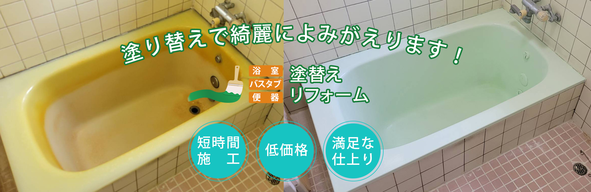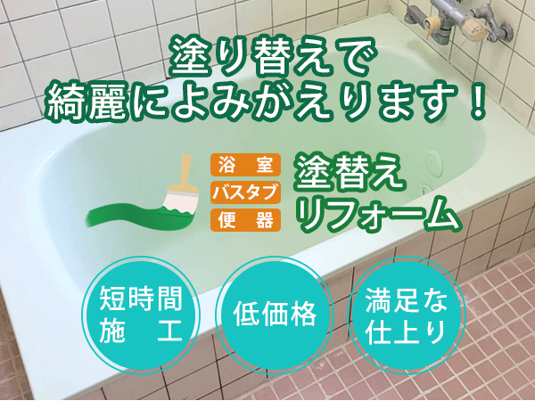 古くなった浴室・バスタブ・トイレ便器など、取り換えるには費用がかかりすぎ。そこで塗替え施工。大幅に低価格でさらに短期間にリフレッシュできます。いま注目されている塗替えリフォームをぜひご検討ください。